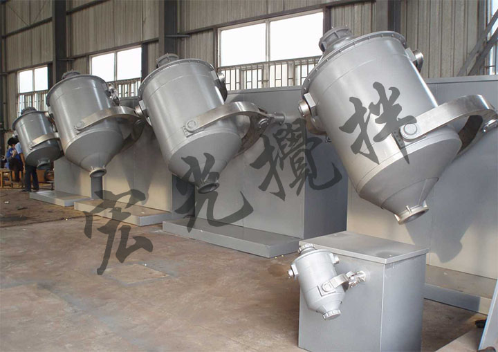 SYH系列三維運(yùn)動(dòng)混合機(jī)裝料的筒體在主動(dòng)軸的帶動(dòng)下,作周而復(fù)始的平移轉(zhuǎn)動(dòng)和翻滾等復(fù)合運(yùn)動(dòng),促使物料沿著筒體作環(huán)向、徑向和軸向的三向復(fù)合運(yùn)動(dòng),從而實(shí)現(xiàn)多種物料的相互流動(dòng)、擴(kuò)散、集聚、參雜、達(dá)到均勻混合的目的。